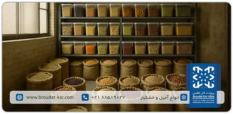 - پیشگیری از کپک و آفلاتوکسین: محیط سرد و کنترلشده، فعالیت قارچهای مشکلزا را محدود میکند؛ کنترل رطوبت خشکبار در کنار تهویه ملایم، ریسک آلودگی را پایین میآورد.