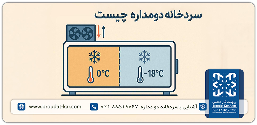 A dual-circuit cold room, or two-circuit refrigerator, is a type of commercial cold room in which a single space is partitioned into two sections: one below-zero and one above-zero. In this configuration, the below-zero section has an active cooling unit, while the above-zero section is cooled by circulating air from the sub-zero compartment. This model typically operates with a single compressor and is a cost-effective solution for restaurants and small retail outlets.